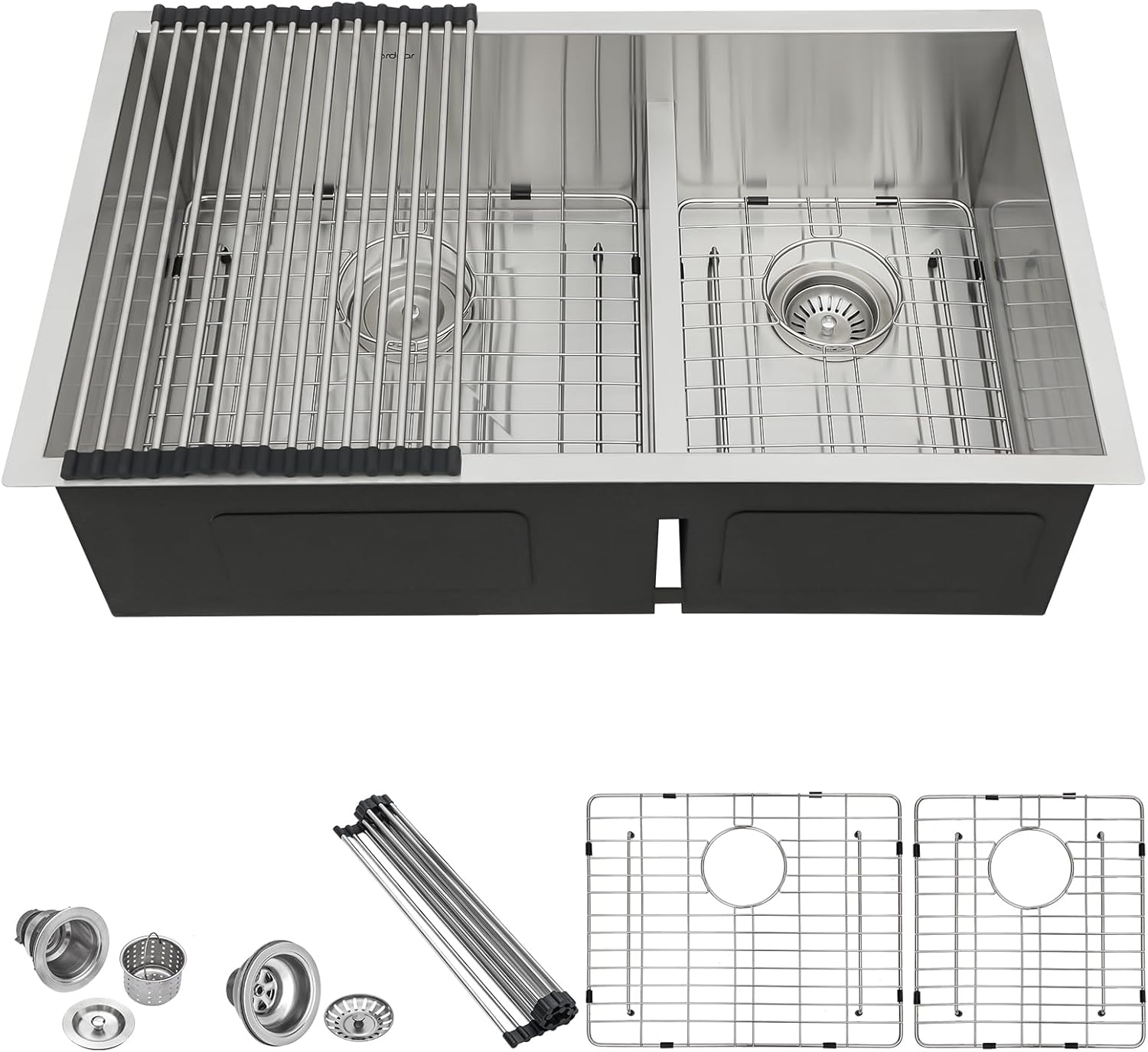 | Included Components | 2x stainless steel bottom grid, 2xdrain assembly, 32x19x10 inch undermount double bowl kitchen sink, a colander, a cutting board, roll up rack |